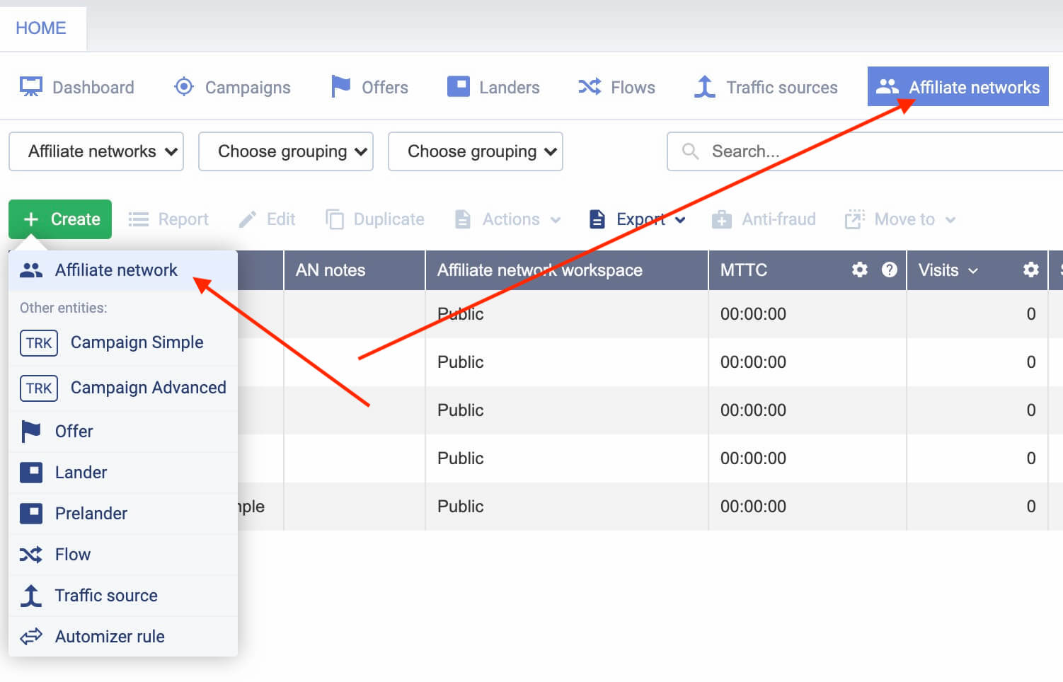 Haz clic en el menú “affiliate networks” y luego clic al botón “create” y selecciona “affiliate network” de nuevo: