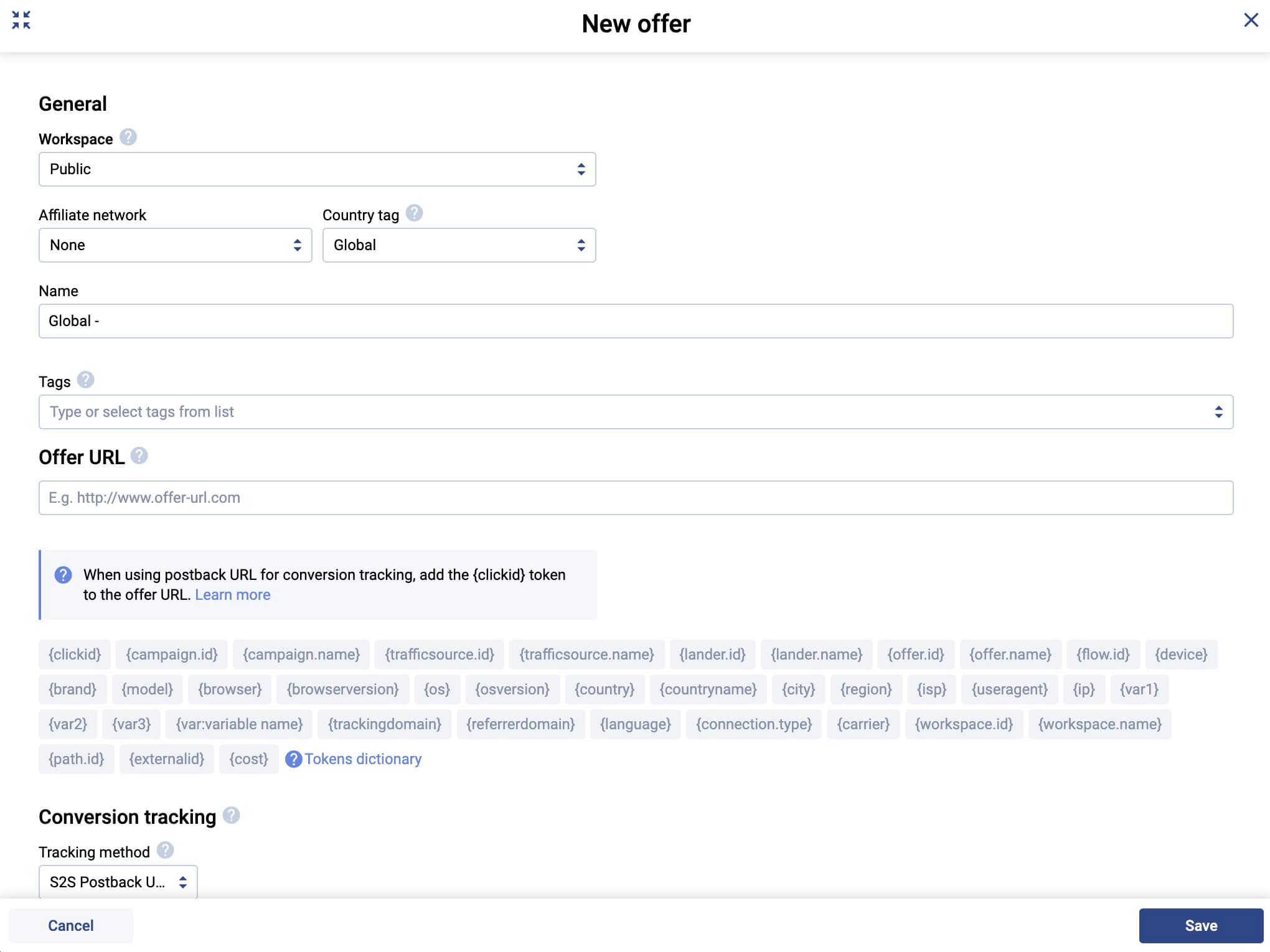 Aquí, necesitas seleccionar la red de afiliación, seleccionar el país donde se pueda promover tu oferta (o déjalo como global en caso de que la oferta acepte múltiples países), dale un nombre a la oferta, y finalmente, añade la URL de la oferta.