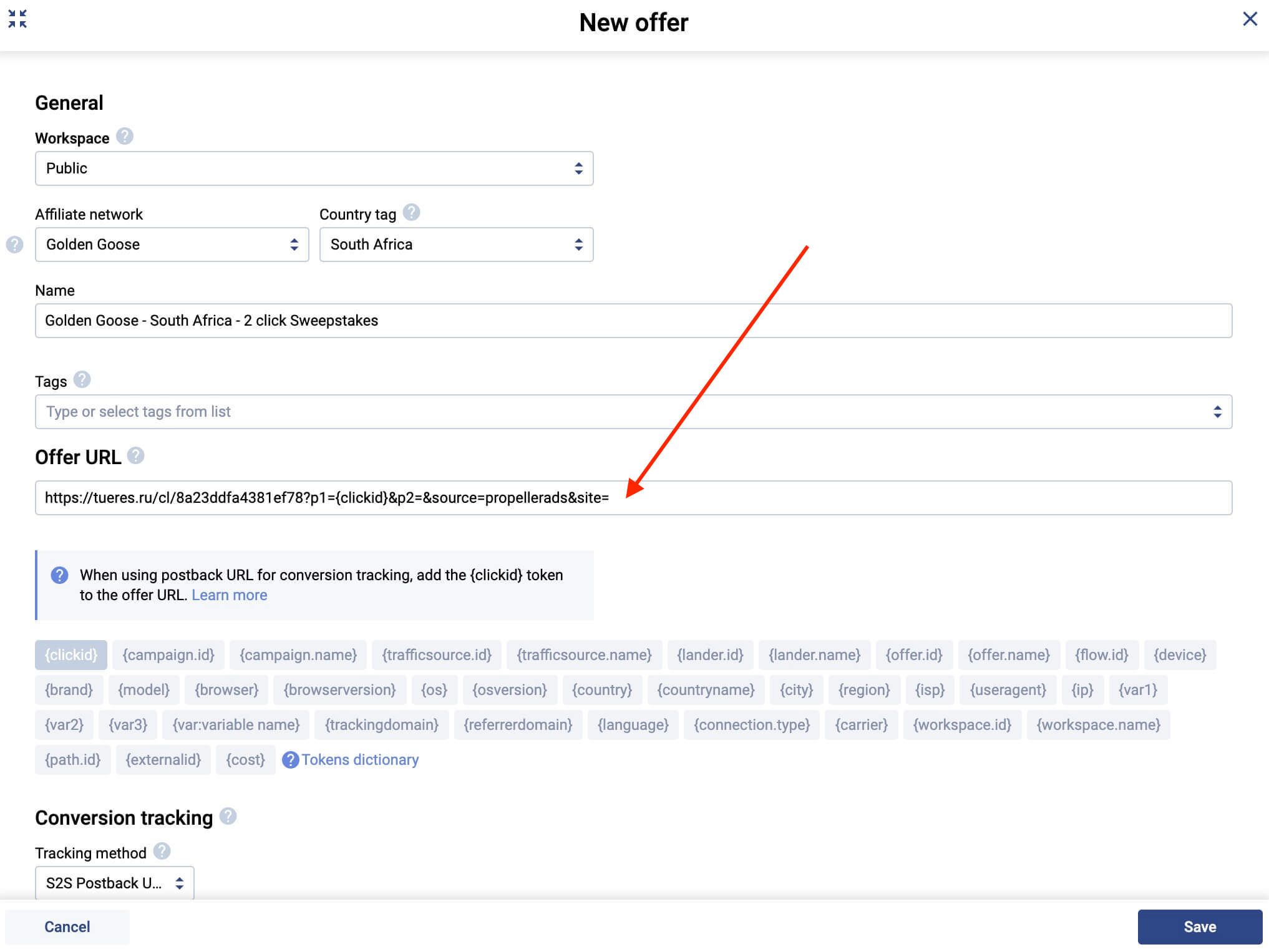 Ahora puedes volver a la URL de promoción y copiarla a tu tracker con los tokens. Tu dominio de URL debería ser diferente pues Golden Goose tiene muchos dominios para cada oferta y los rotan de vez en cuando. Copia esta URL: