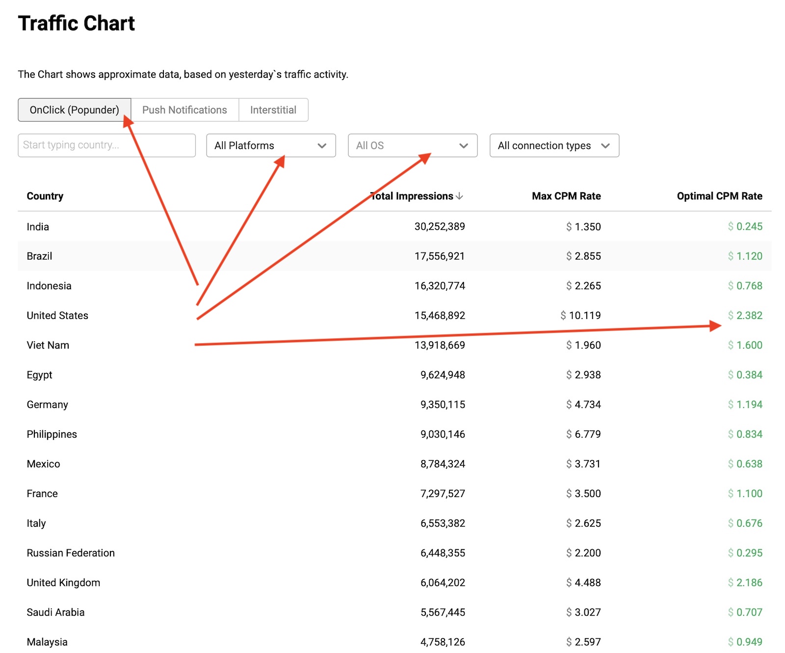 Después de que hayas añadido dinero a tu cuenta, visita el menú “Traffic Chart” para tener una idea del tráfico disponible, países y dispositivos que quieras comprar.