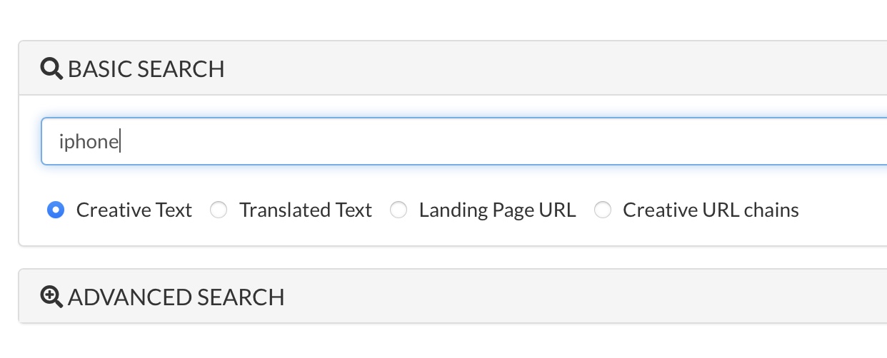 Puedes buscar las creatividades de los anuncios o páginas de aterrizaje por palabras clave usando la función de búsqueda mostradas aquí: