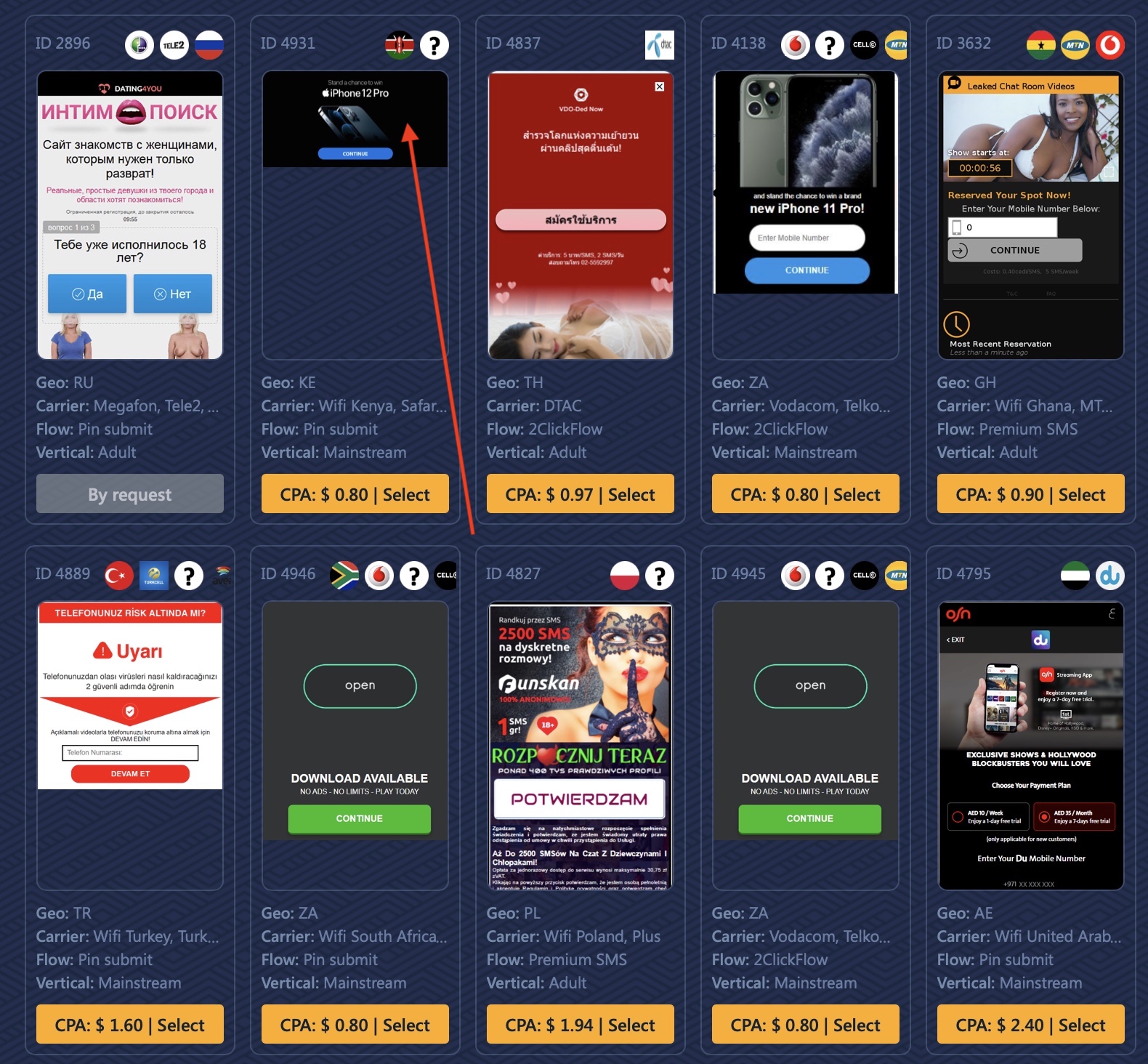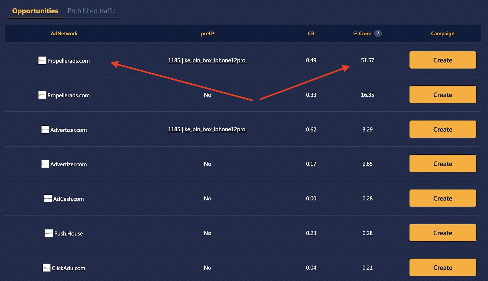 Si bajas verás la lista de oportunidades, que incluyen una lista de redes de anuncios y las páginas de aterrizaje que las personas están usando conjuntamente junto con el CR (Conversion Rate, Ratio de Conversión) y el % de conversiones que la oferta recibe hasta ahora del CAP (número total de conversiones disponibles dadas a la red de afiliación por parte de los anunciantes).