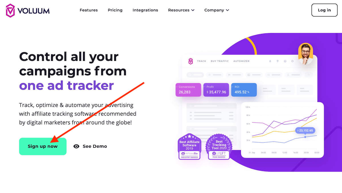 Primero, necesitas crear una cuenta Voluum. Abre su sitio web y haz clic en este botón: