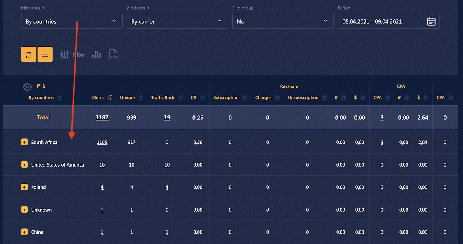 Por ejemplo, si estás ejecutando una oferta de múltiples países, puedes comprobar la ejecución de cada uno con el número de conversiones y luego segmentarlo por operador, tal y como hice en la captura siguiente.