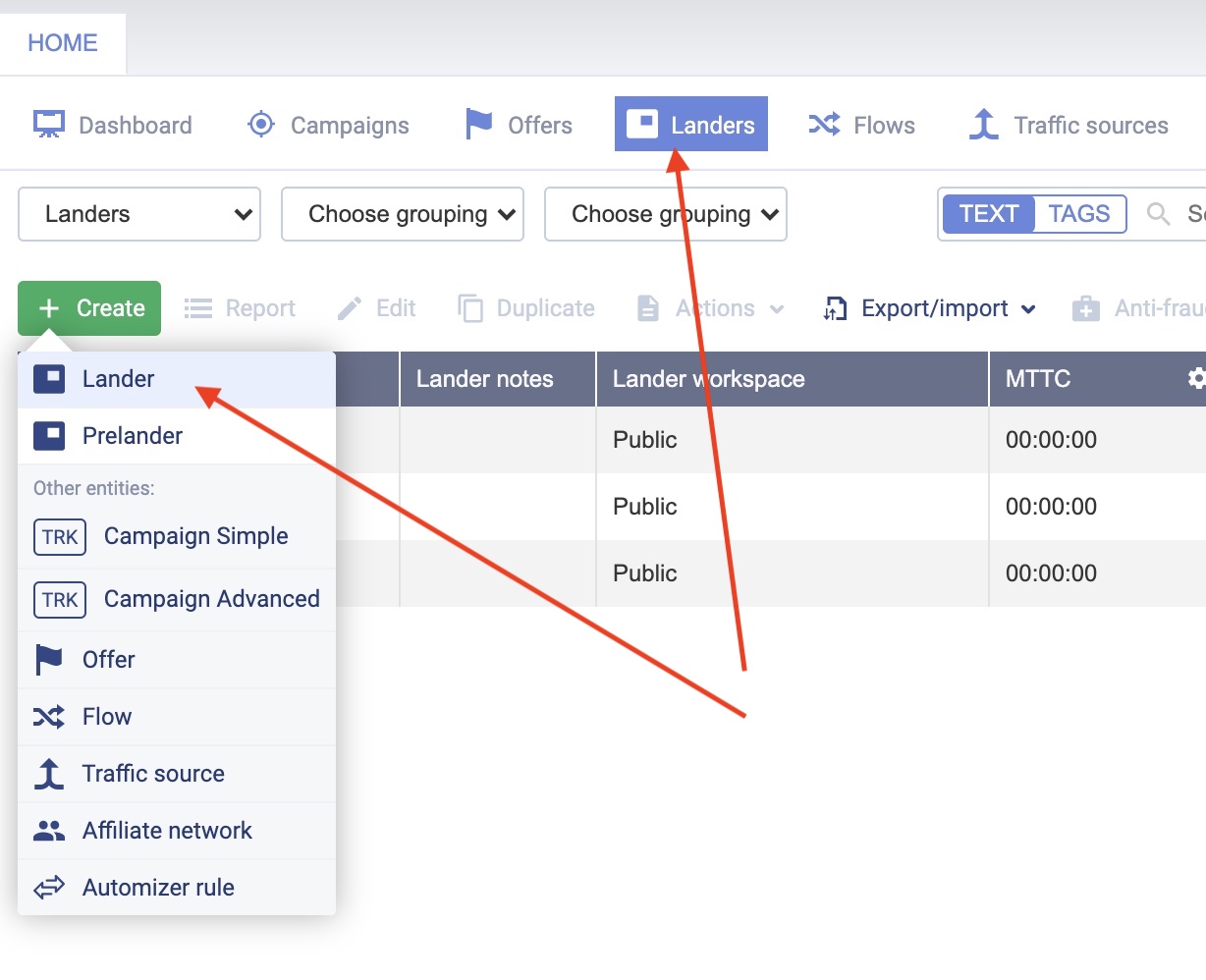 O primeiro passo requer que você tenha uma landing page já hospedada em algum servidor web. Você só precisa pegar o URL da sua landing page e depois ir para a guia “landers” no seu rastreador.