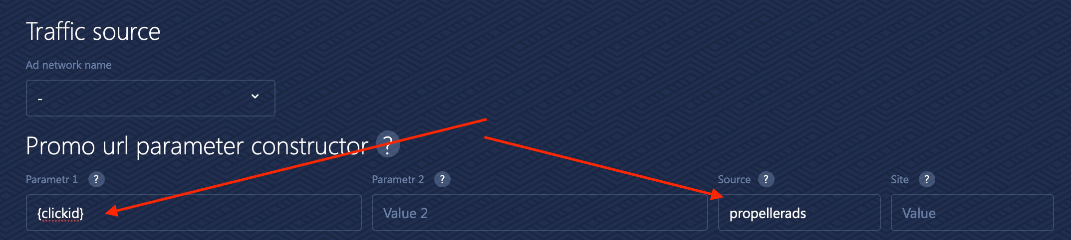 Eu adicionei PropellerAds como fonte, mas você pode escrever o nome de qualquer fonte que estiver usando naquele momento ou até deixar em branco. Contanto que você adicione o {clickid} no parâmetro 1, já é o suficiente.