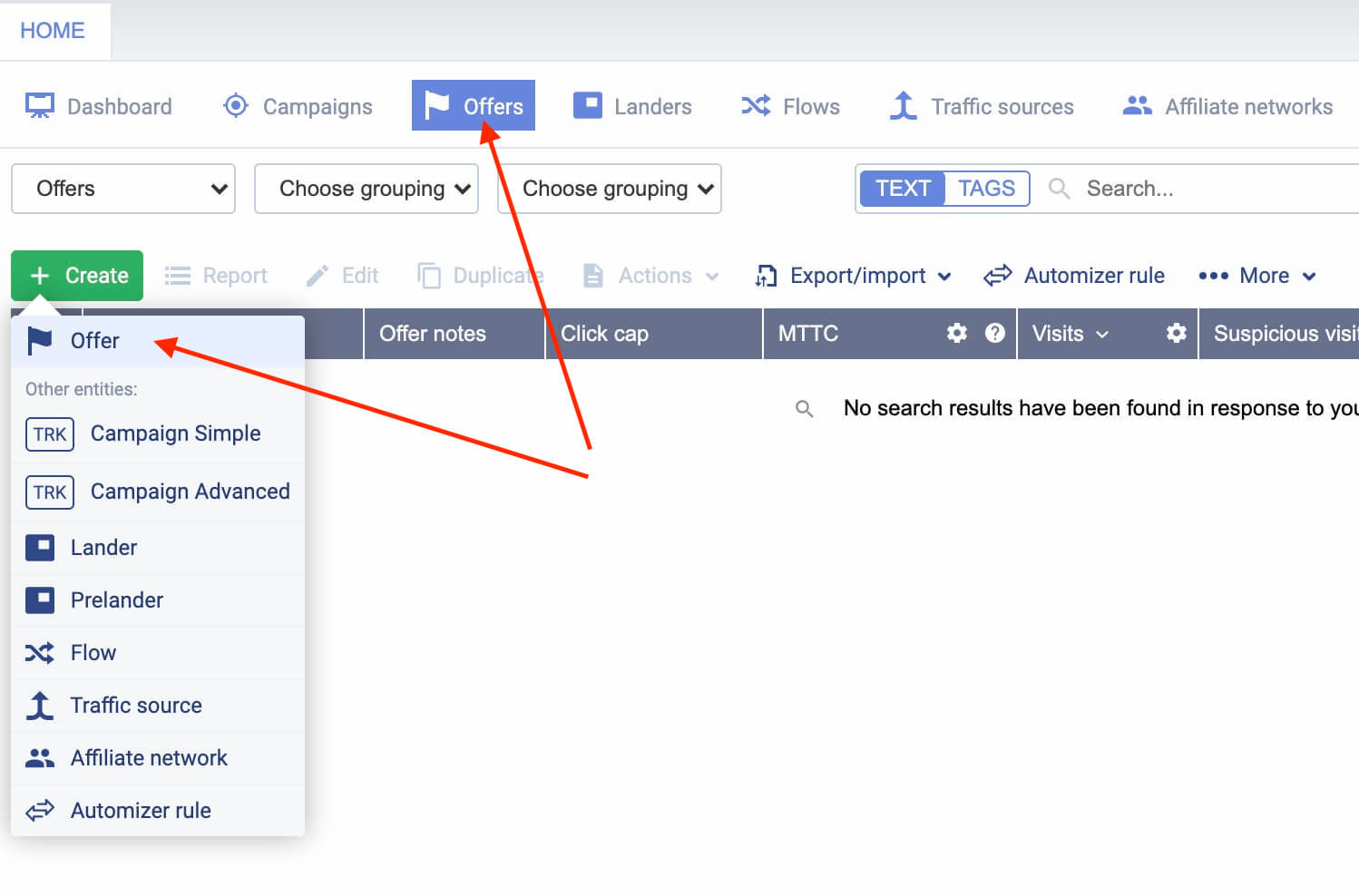 Vá para a aba de ofertas, clique no botão “criar” e selecione “oferta”.
