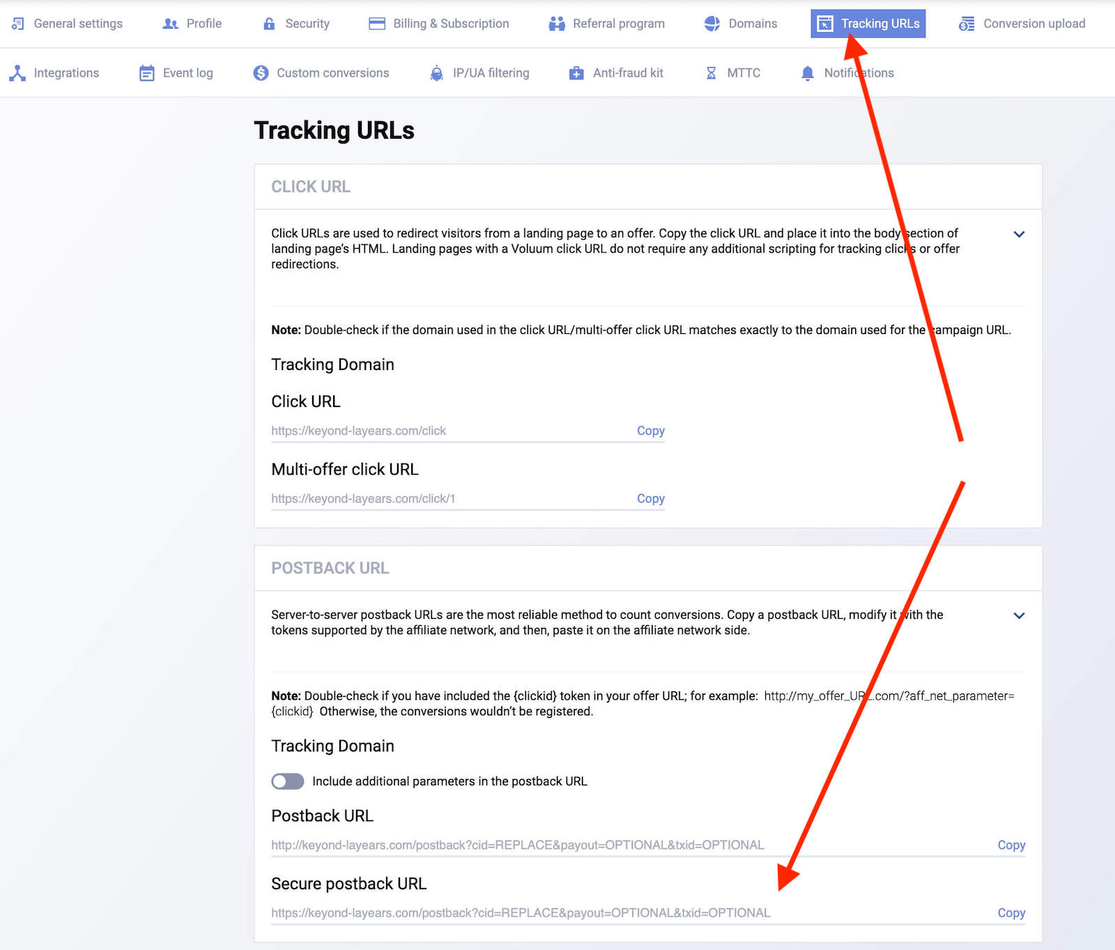 Agora selecione o menu “URLs de rastreamento” e role para baixo até a área “URL de postback”. Copie seu URL de postback seguro: