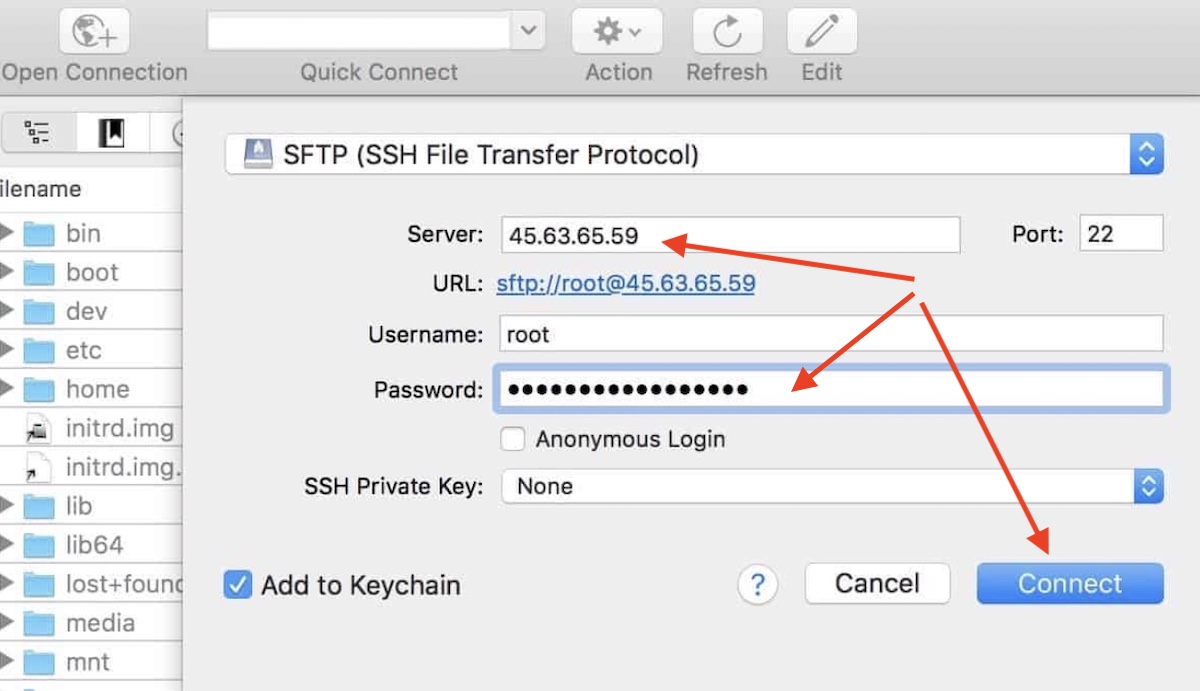 Selecione o protocolo SFTP para se conectar ao seu servidor e então você precisará do IP do seu servidor. Este é o mesmo IP que você usa para conectar seu servidor ao Namecheap e ServerPilot.