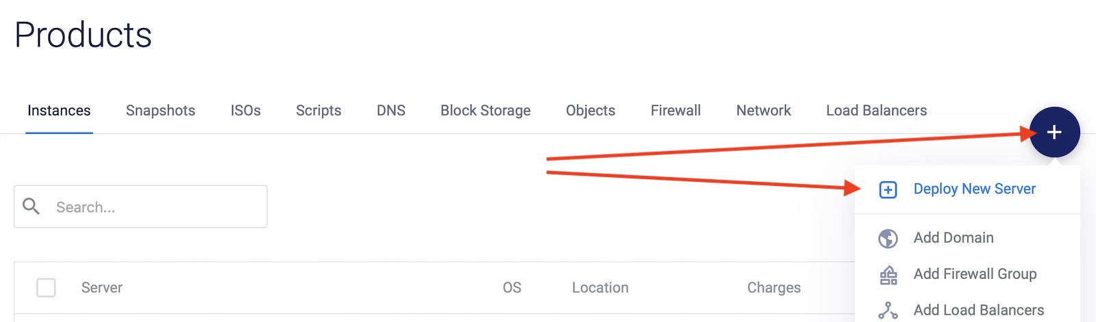 Depois que sua conta for aprovada e você puder fazer login no seu painel, clique no botão + e selecione “implantar novo servidor”: