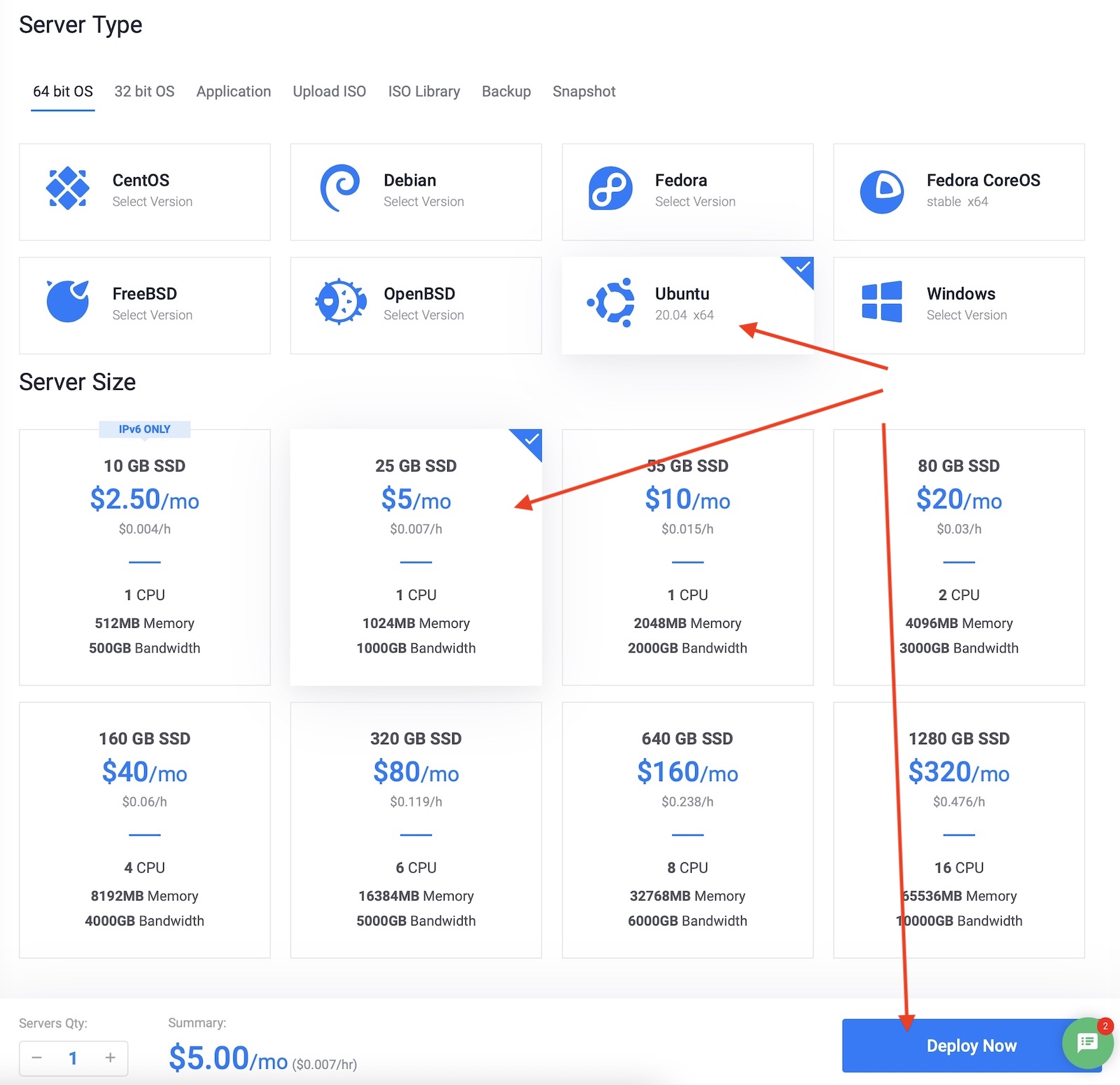 Como você pode ver, selecionei o Ubuntu 20.04 como meu sistema operacional e também estou escolhendo o VPS de $ 5 por mês. Depois disso, clique no botão “implantar agora” e dê alguns minutos ao Vultr para criar seu servidor virtual na nuvem.
