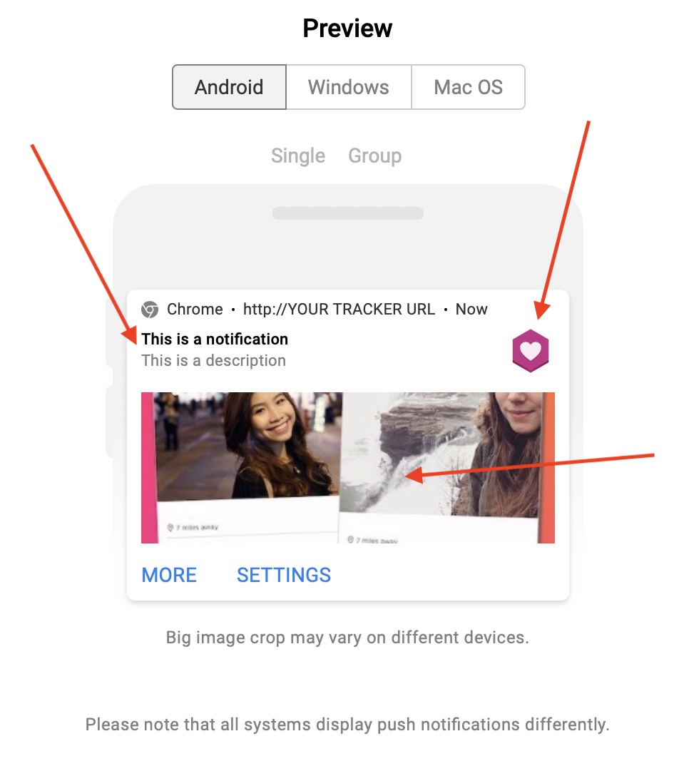 No início deste guia, mostro como as notificações por push são exibidas em diferentes dispositivos, no entanto, quando você cria suas notificações por push em uma fonte de tráfego, há 4 componentes que você precisa entender: