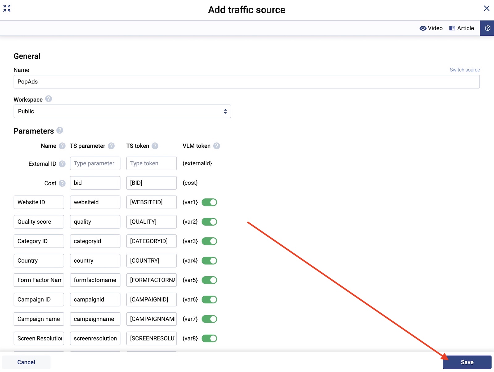 Everything will be set and good to go, including the tracking tokens and postback for this traffic source. Just click “save” and you’ll be good to go.
