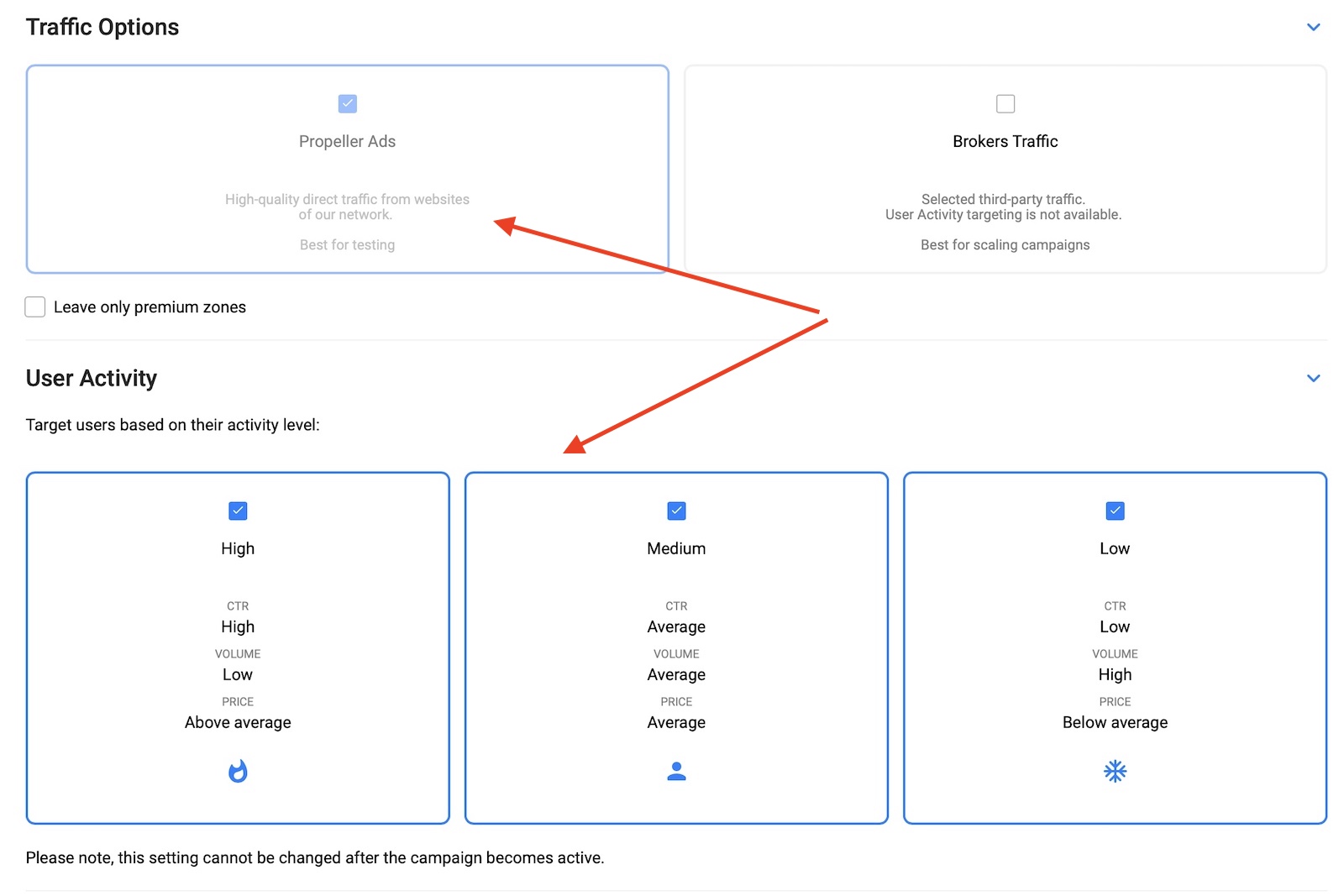 As for user activity, you can choose three types according to the average CTR and activity levels. If you test a new campaign you can select them all, but ideally, you want to create different campaigns for each activity level as the bids are also different and the CTR and other engagement metrics can vary widely between them.
