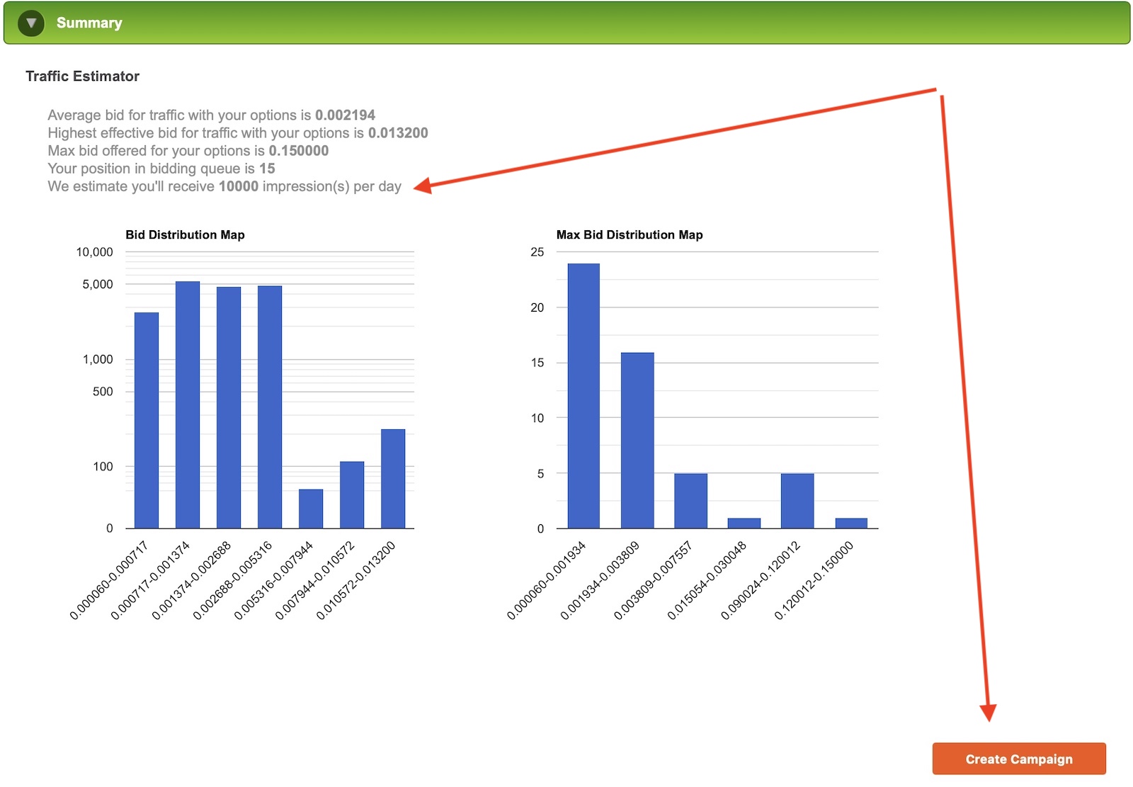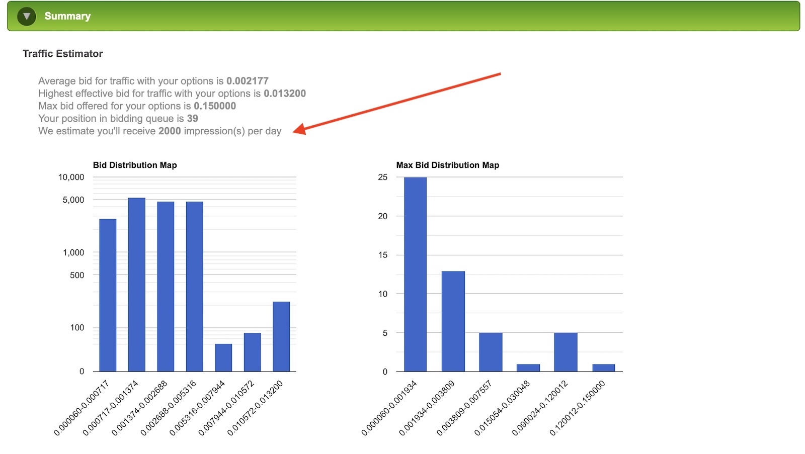 Go back to the “budgets” section and input your desired bid and then go back to the “summary” section. You will now see an estimated number of impressions (pops) per day.