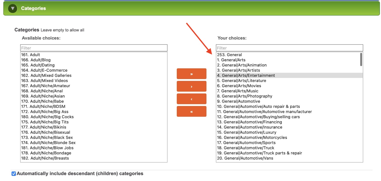 Here, you have tree choices at the beginning. If you’re running a mainstream campaign, select all the “general” categories. If you’re running an adult content campaign, select all of the “adult” categories, or if your offer accepts both types of traffic, leave them all to get traffic from both types of websites.