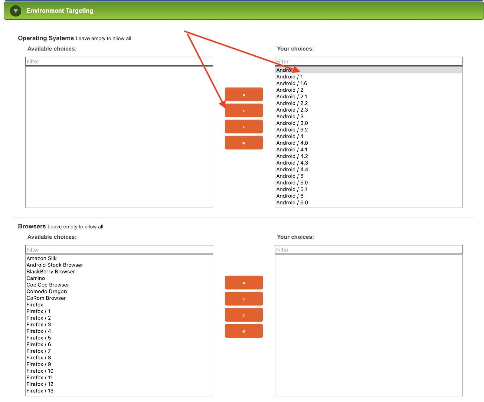 Here you need to select the OS and browsers you want to target. If you don’t know which OS or browser you want to test, leave them all as it is by default and you’ll target them all at once. Later you can come back and remove the ones that aren’t working for your campaign.