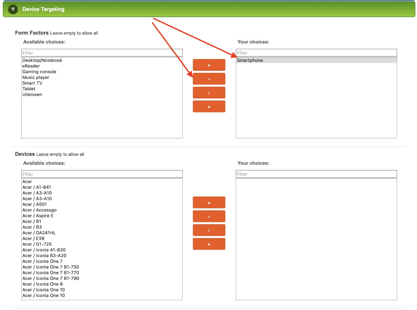 Here you need to select the form factor (device type) and you can also select specific devices, such as a specific phone model from any brand. In my opinion, you should only select a form factor here, such as desktop, smartphone, or tablet, and later come back with your campaign data to see if you can block specific devices that aren’t converting.