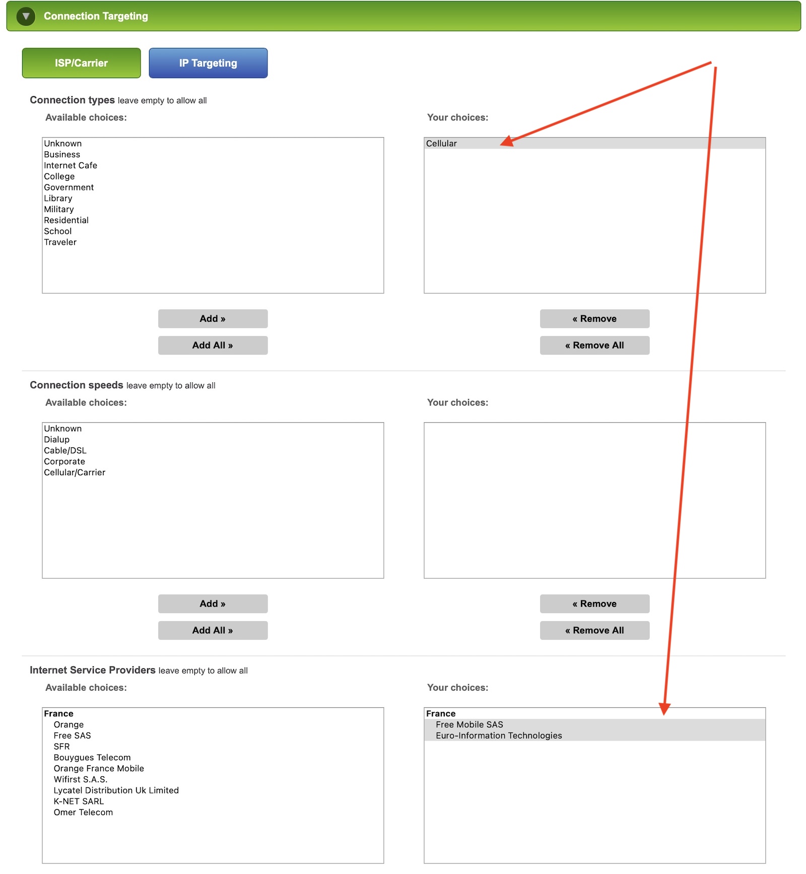 Here, you need to select a connection type in case your campaign only works for certain carriers. Choose “cellular” for the connection type if you’re promoting an mVAS offer that only works for certain carriers and you will be able to select the carrier companies as well.