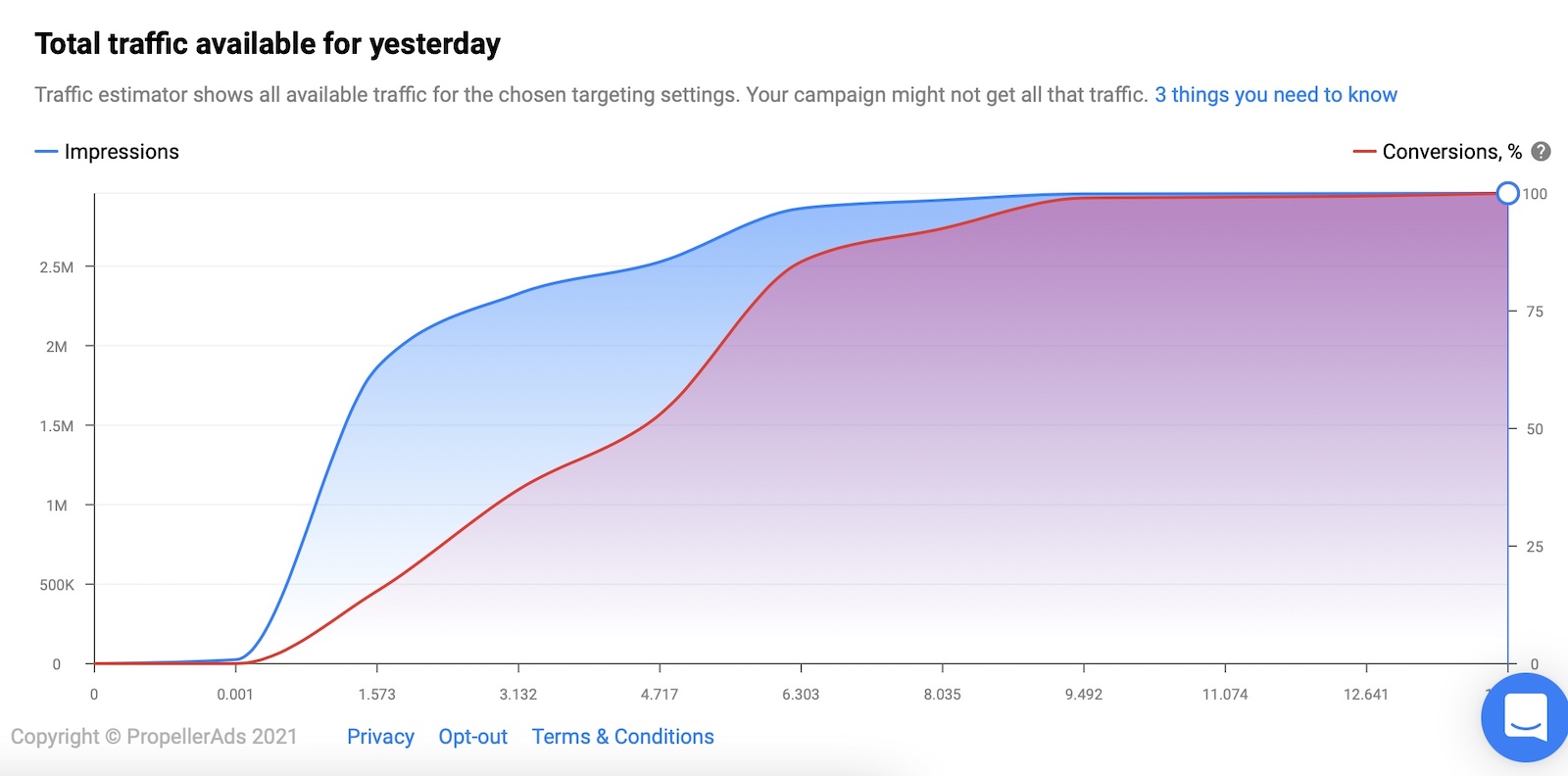 After you’ve added money to your account, please visit the “Traffic Chart” menu to get an idea of the traffic available for the geo and device you want to buy traffic from.