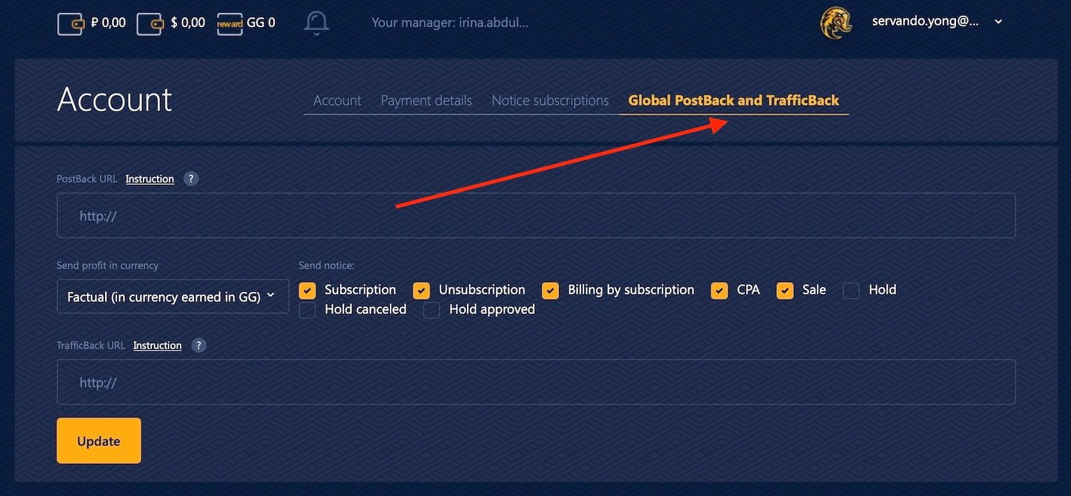 Paste the same Postback URL we just used on the offer page here and set your currency, then hit “update”.