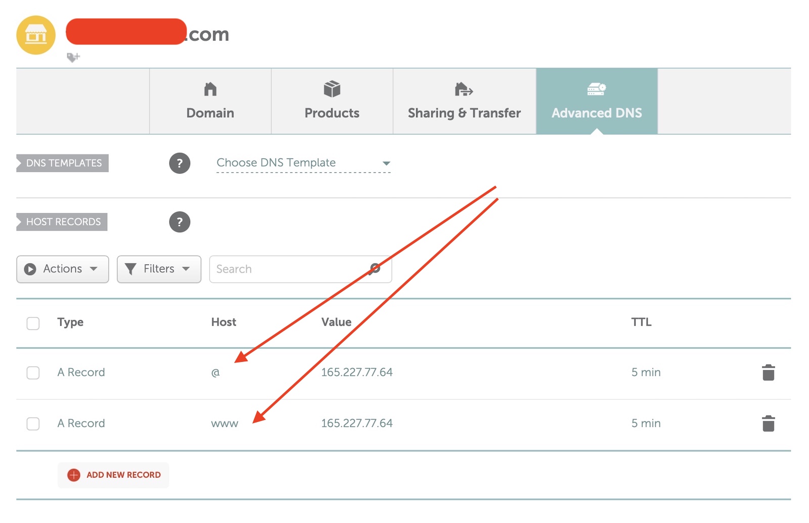 As for the host, one needs to be set as “@” and the second one needs to be set as “www”. Set the TTL as 5 minutes to see changes as soon as possible. Your setup will look the same as the image above but with your own server IP address.